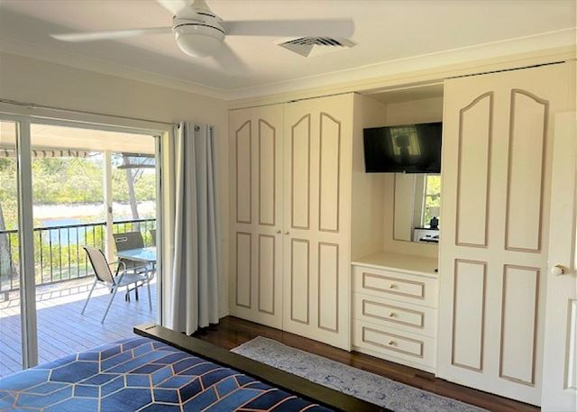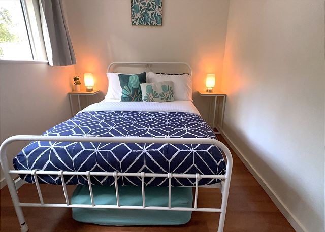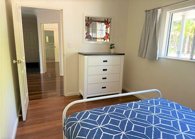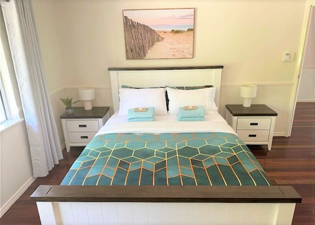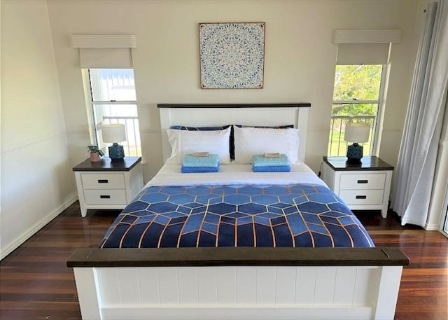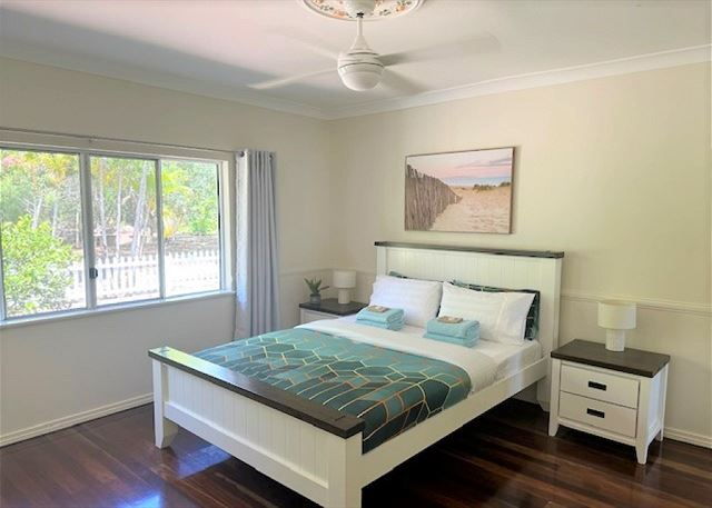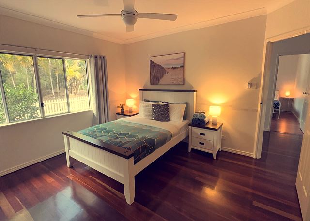 BEDROOM 2 – This bedroom has a comfy queen bed, built in wardrobe, ceiling fan and overlooks the water with access onto the timber deck.
