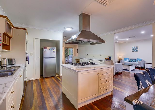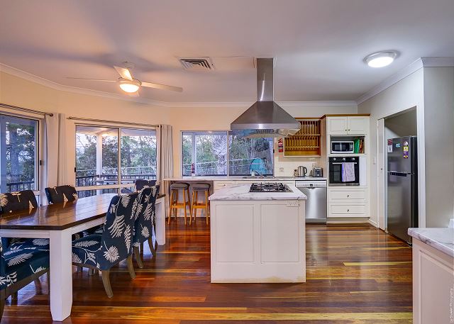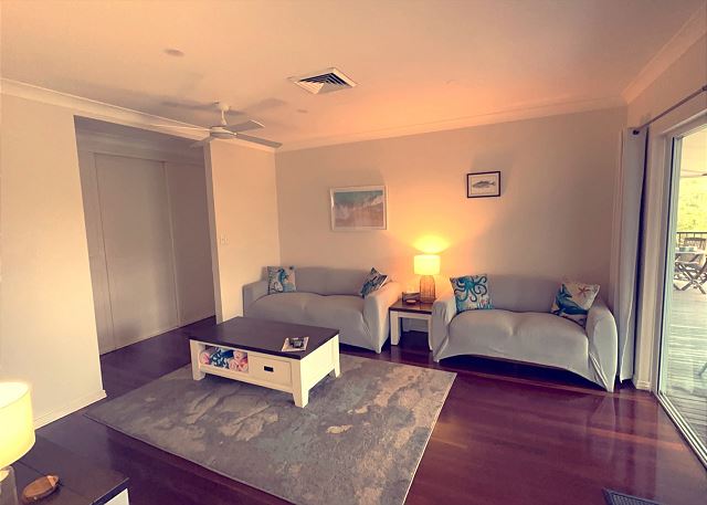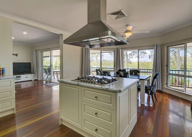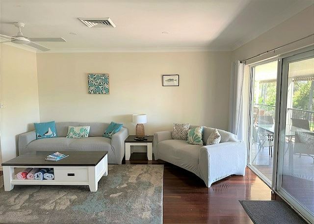 LIVING – The open-plan lounge, dining, and kitchen open out on the large timber deck with BBQ. The deck overlooks the water where you can watch the kiddies in the water or wine & dine while enjoying the amazing sunsets in the afternoon.