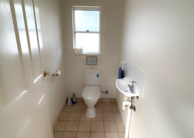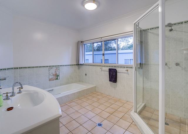 Main Bathroom – A spacious family bathroom with a shower, sunken bath and separate toilet.