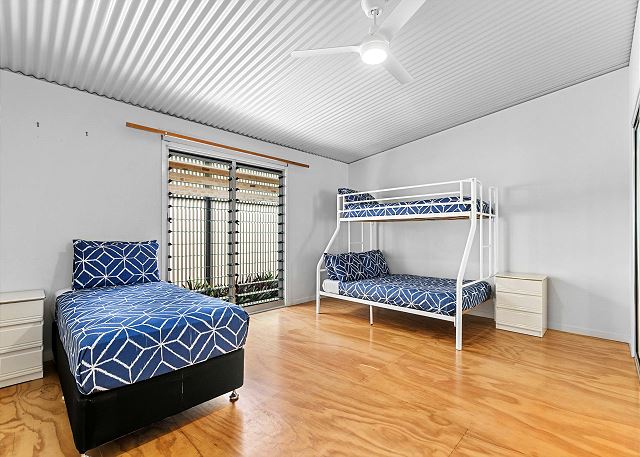 Bedroom 2 – Air conditioned - This spacious bedroom sleeps 4 with 1 tri-bed (single on top and double underneath) and 1 single bed & ceiling fan.