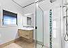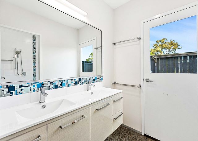 Laundry / Shower Room – The laundry offers a large top loader washing machine, a wall-mounted clothes dryer, an iron, and an ironing board. The laundry is combined with a separate extra-large 2-person shower room with double showerheads. The dual basin vanity is separate from the shower room.